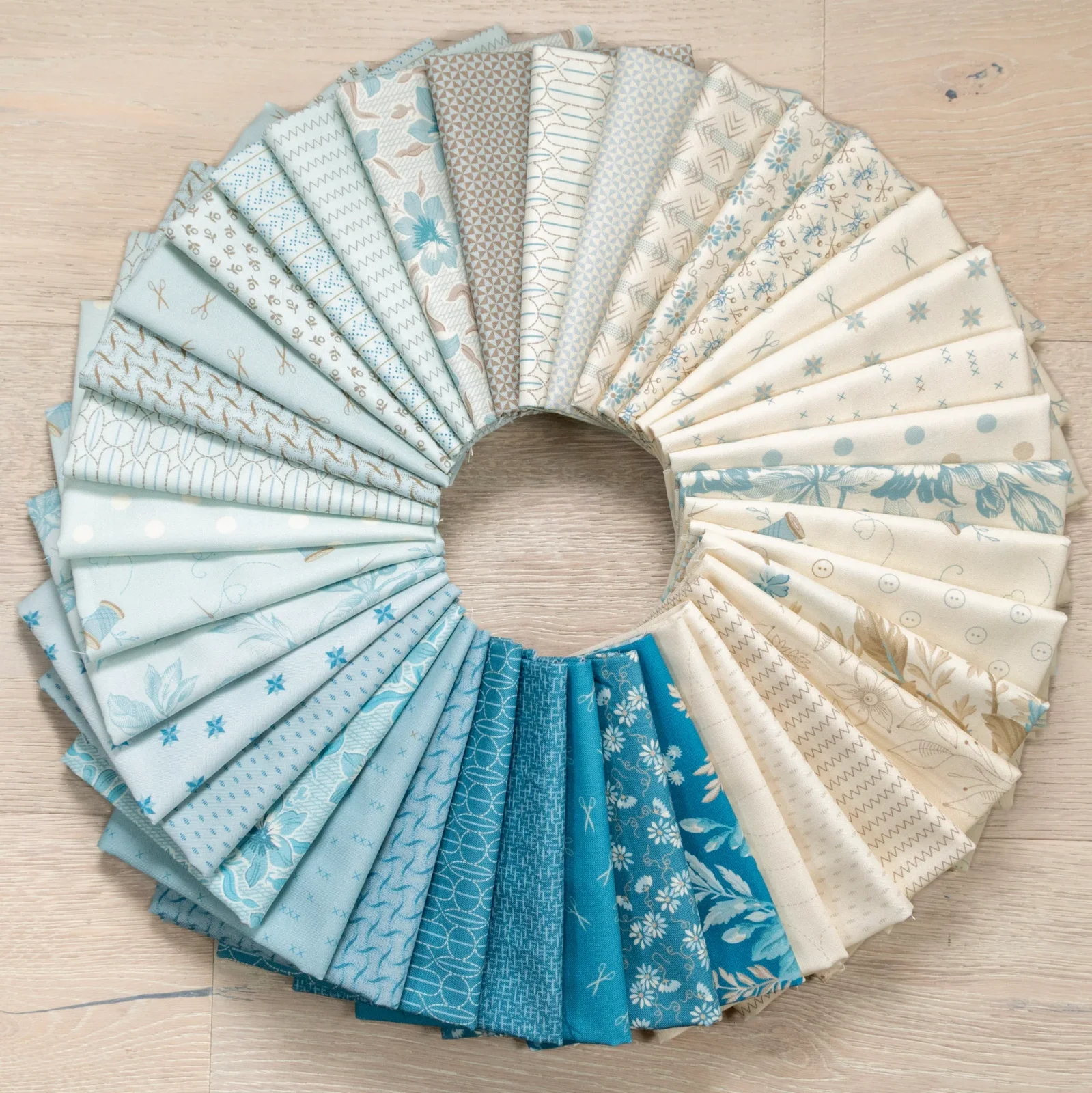 Edyta Sitar - Andover FabricsThis collection features a classic palette of soft blues and neutrals, including cream, adorned with floral and bird motifs, as well as sewing-themed elements like thread spools and scissors. The collection is designed to evoke a sense of timeless elegance, reminiscent of the "Bluebird" collection also by Edyta Sitar.
